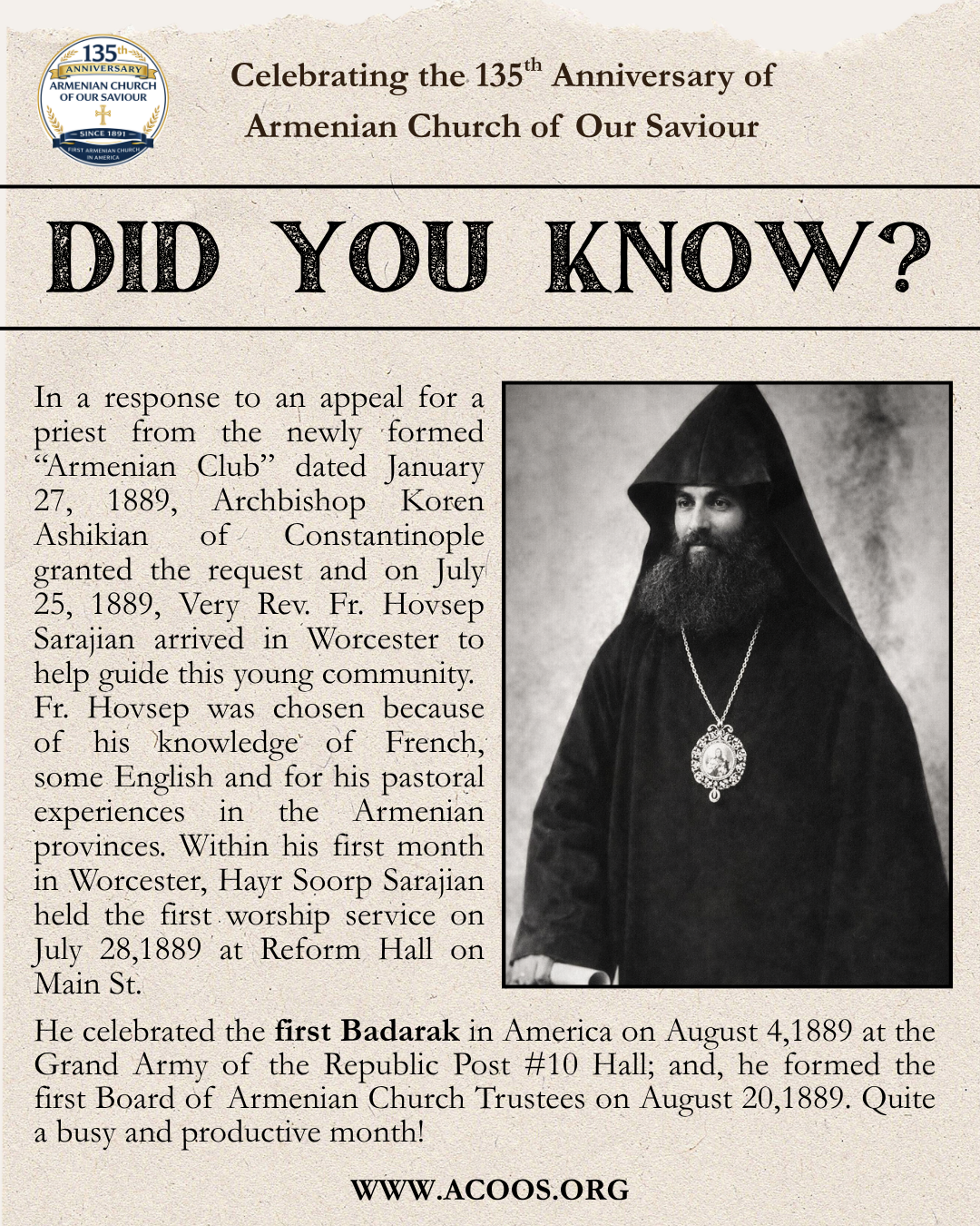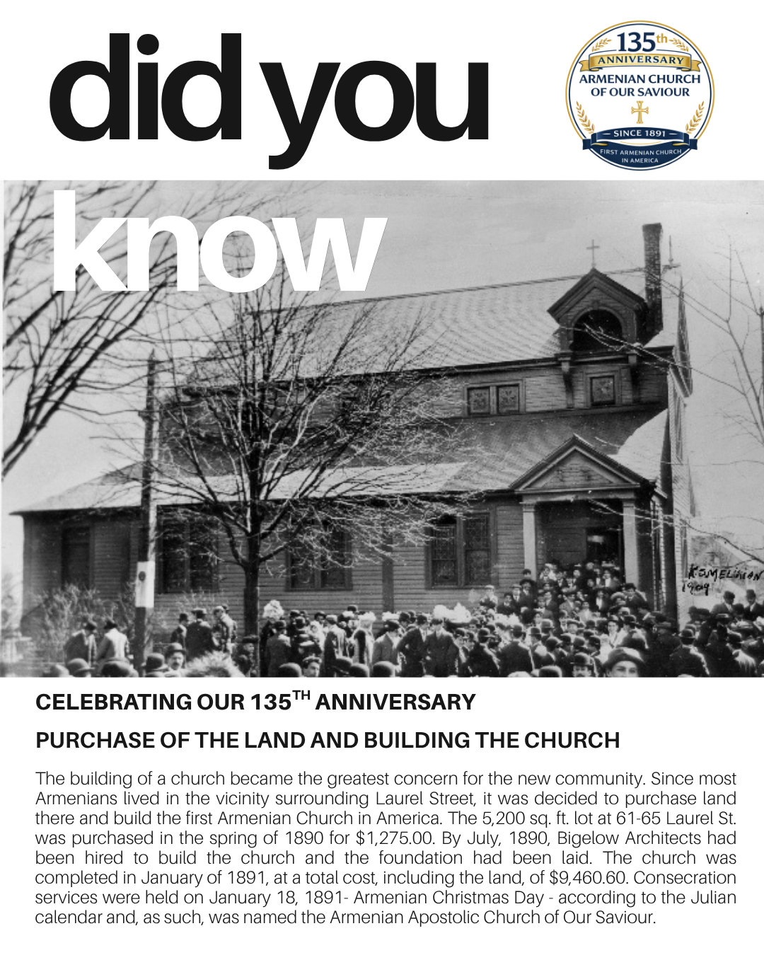 To celebrate the 135th Anniversary of our Church and learn more together about the founding of the first Armenian church in America, we are launching a new campaign called “Did You Know?” Every other week, we will share interesting facts about the foundation and history of our church.