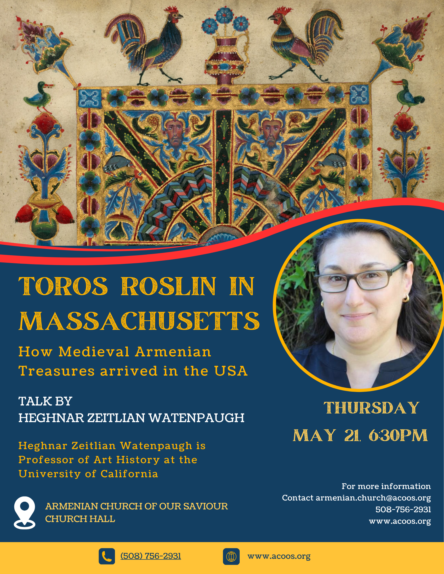 Armenians who immigrated to the United States brought with them with their families, language, culture, and sometimes also sacred books and objects from their hometowns. Especially after the Armenian Genocide of 1915, masterpieces of Armenian medieval art arrived in the United States. Some were later incorporated into the collections of some of the USA’s most prestigious museums. This talk will focus in particular on the works of Toros Roslin, one of the greatest medieval Armenian illuminators. Several works signed by Roslin, and others attributed to him are located today in American museums, including the Canon Tables from the Zeytun Gospels of 1256, today at the J. Paul Getty Museum in Los Angeles. Before arriving in Los Angeles, the Canon Tables of the Zeytun Gospels spent decades in a family home in Watertown, Mass. This talks tells the stories of families, immigration, sacred art, and the movement to reclaim Armenian cultural heritage today.